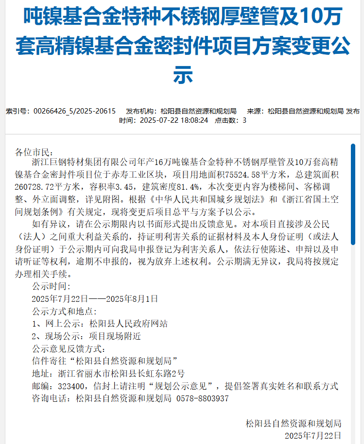 2025年7月22日,浙江巨鋼特材集團有限公司年產16萬噸鎳基合金特種不銹鋼厚壁管及10萬套高精鎳基合金密封件項目方案變更公示,公示時間:2025年7月22日-2025年8月1日。